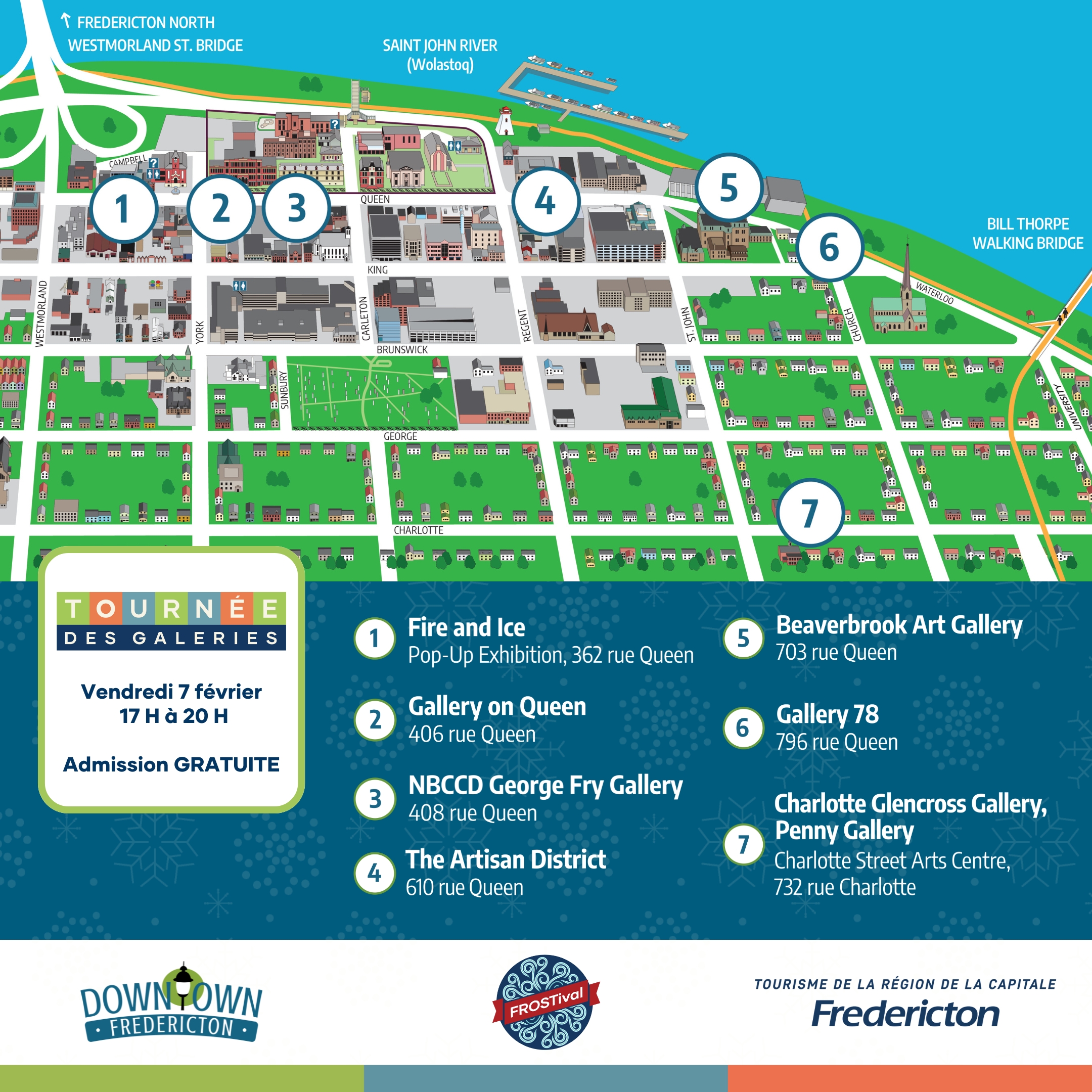 Faites une tournée hivernale des galeries du centre-ville de Fredericton avec vos amis. Admirez les plus récentes expositions et rencontrez les artistes ainsi que les propriétaires et les directeurs des galeries. De légers rafraîchissements seront servis et il y aura de la musique.