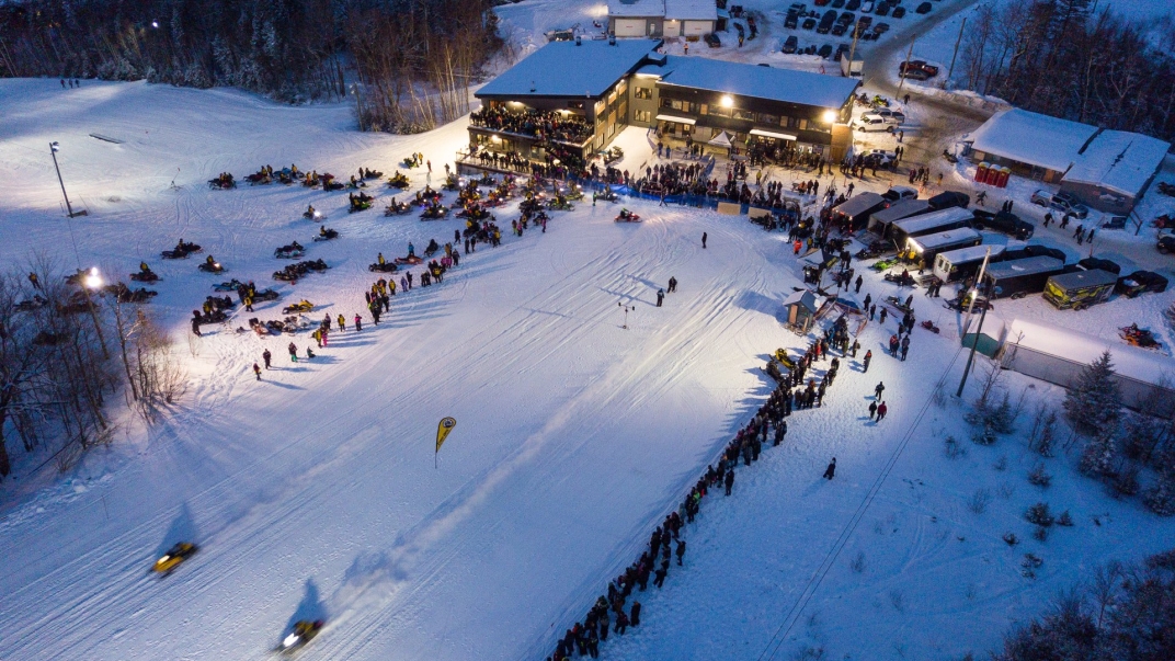 Profitez du divertissement offert par des courses de motoneiges nocturnes sous les projecteurs de Crabbe Mountain!